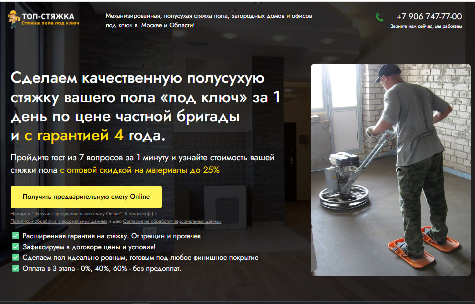 Она ведёт «нужных людей» на лендинг, который отсеивает «мелочь» с мелкой квадратурой и с бюджетом до 80 000 рублей. А остальных превращает в заявки на стяжку пола.